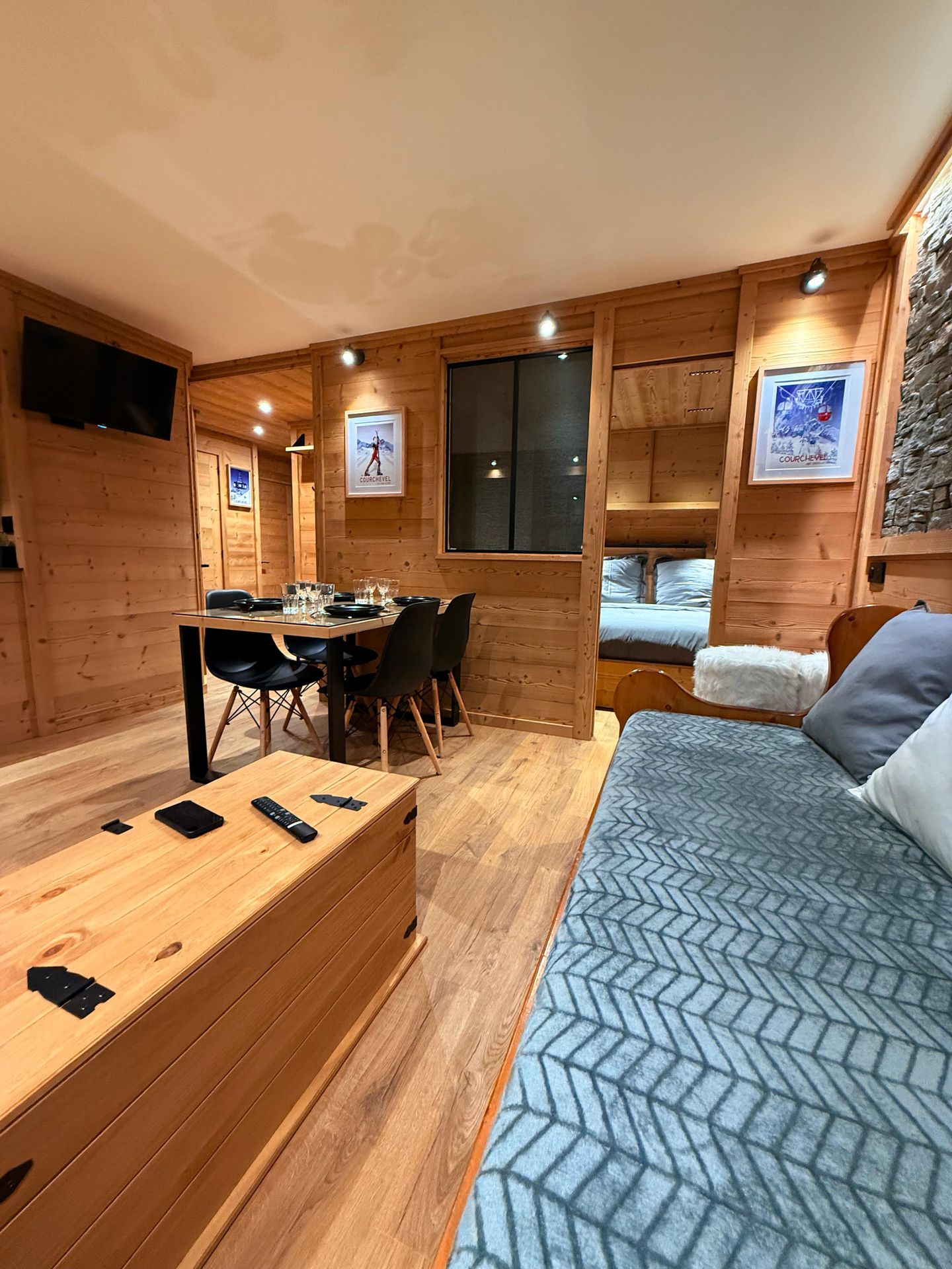 Welcome to this modern and bright apartment, ideally located in the prestigious Courchevel resort. Accommodating up to 4 guests, this cozy apartment is perfect for a mountain getaway. The apartment offers two comfortable bedrooms: the first with a double bed, and the second with two bunk beds, making it ideal for a family or friends getaway.