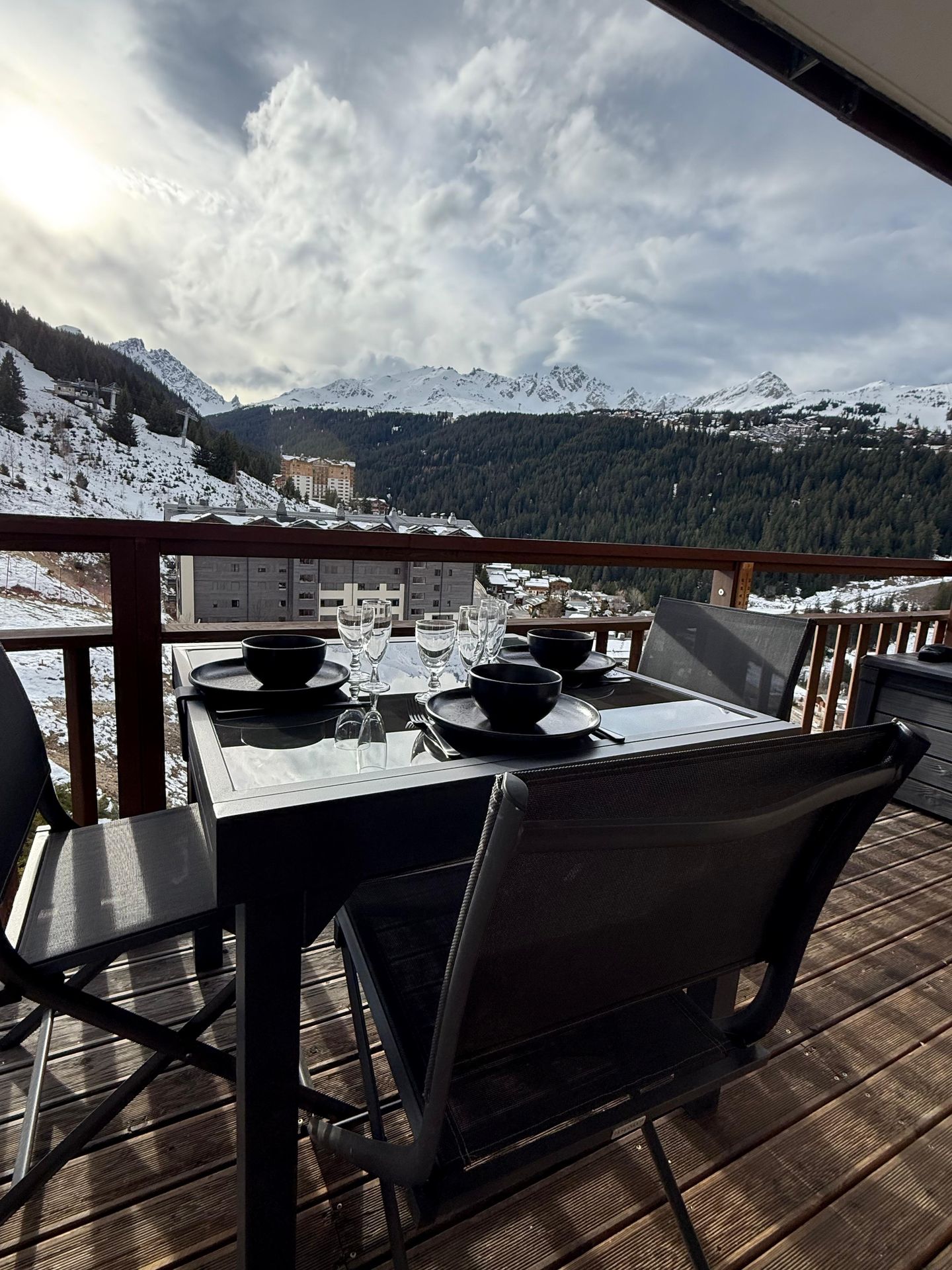 Relax on a south-facing terrace with outdoor furniture for relaxation after a day of skiing, offering a panoramic mountain view.