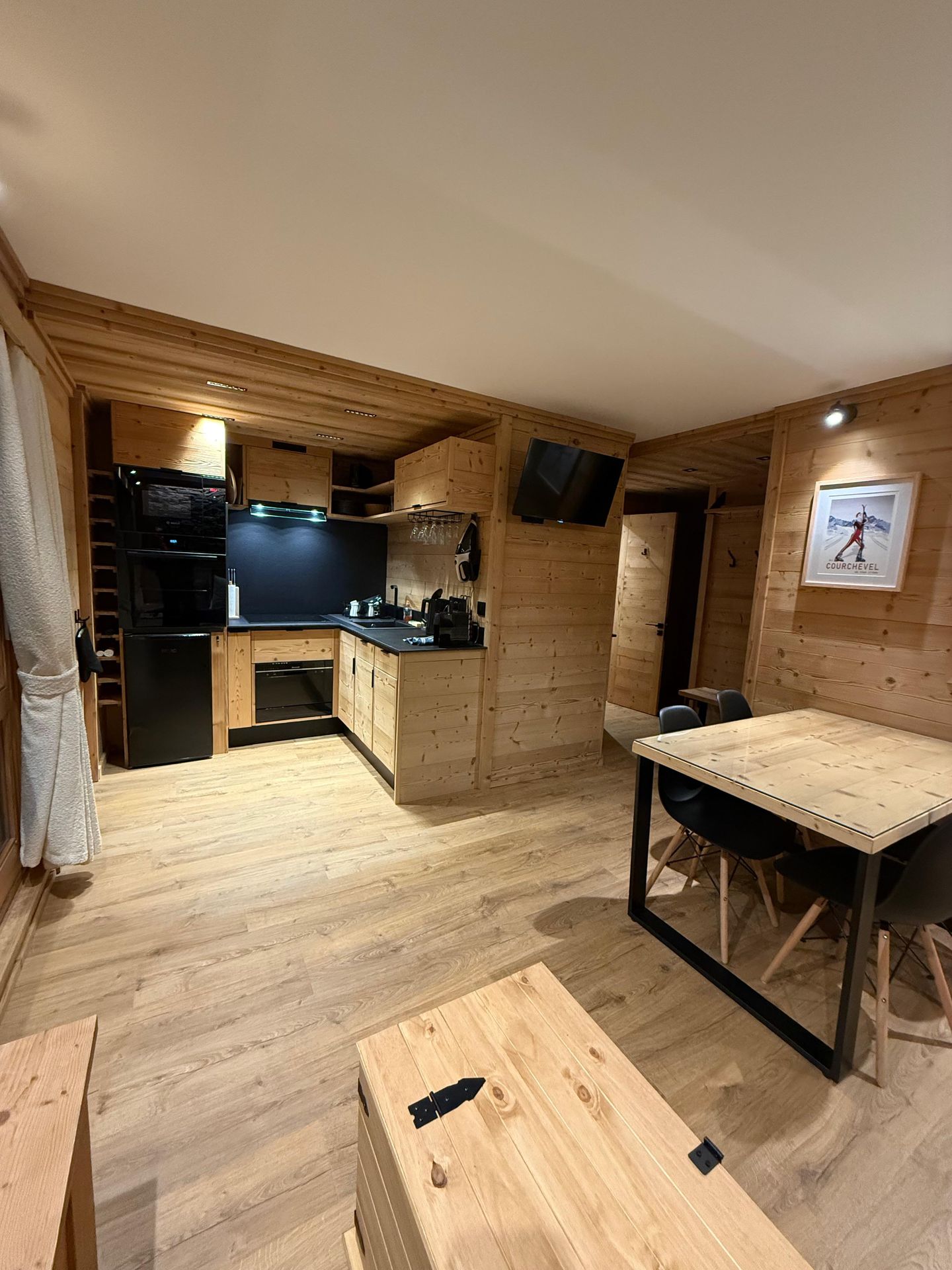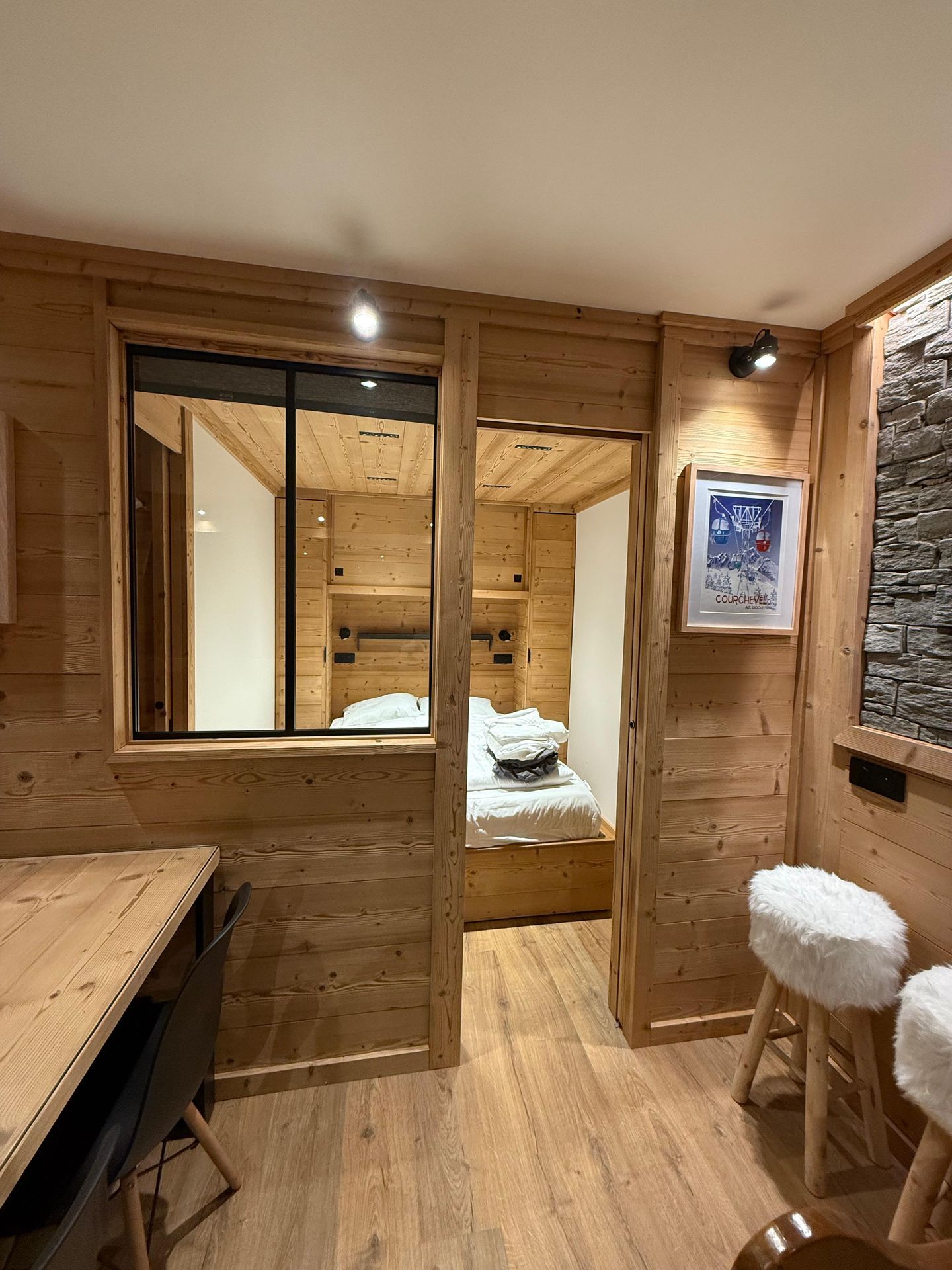 Welcome to this modern and bright apartment, ideally located in the prestigious Courchevel resort. Accommodating up to 4 guests, this cozy apartment is perfect for a mountain getaway. The apartment offers two comfortable bedrooms: the first with a double bed, and the second with two bunk beds, making it ideal for a family or friends getaway.